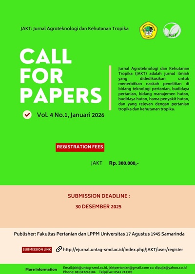 AKT : Jurnal Agroteknologi dan Kehutanan Tropika adalah jurnal ilmiah yang didedikasikan untuk menerbitkan naskah penelitian di bidang teknologi pertanian, budidaya pertanian, bidang manajemen hutan, budidaya hutan, hama penyakit hutan, dan yang relevan |