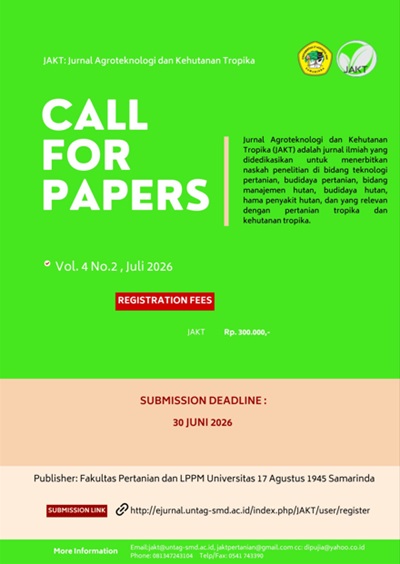 JAKT : Jurnal Agroteknologi dan Kehutanan Tropika adalah jurnal ilmiah yang didedikasikan untuk menerbitkan naskah penelitian di bidang teknologi pertanian, budidaya pertanian, bidang manajemen hutan, budidaya hutan, hama penyakit hutan, dan yang relevan